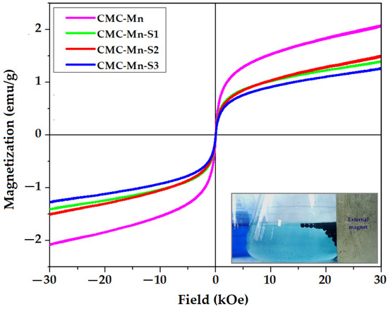The magnetization curves of MnFe2O4-loaded CMC beads (CMC-Mn and CMC-Mn-S1-3) were determined by using VSM, as shown in Figure 5. All the CMC-based magnetic beads presented magnetization loops similar to those of pure manganese ferrite (Figure 2c). Thus, the investigated beads keep their superparamagnetic character, as indicated by the lack of hysteresis as well as zero coercivity and remanence. However, the decrease of the magnetization values (registered at 30 kOe) from 28.77 emu/g (pure MnFe2O4) to values ranging from 1.2 to 2.1 emu/g should be mentioned, as given in Table 1. This can be attributed to the use of small amounts of ferrite (only 10%) in the polysaccharide matrix. For the same reason, the addition of SDS led to an additional proportional decrease in magnetization. However, an exception is made by the CMC-Mn-S2 beads, which have a slightly higher magnetization when compared to the beads with less SDS (CMC-Mn-S1), although the initial trend was the opposite. The magnetization values and the superparamagnetic properties of the beads are sufficient for providing easy separation from a solution when an external field is applied, even when the beads are charged with the adsorbed dye (as the lower right corner image from Figure 5 demonstrates).