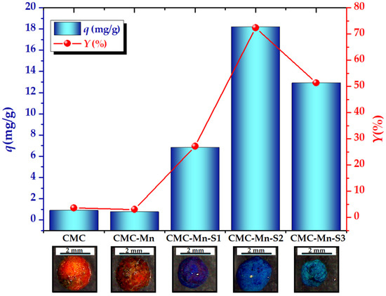In order to determine the adsorption performance of MB cationic dye from aqueous solutions under the same conditions onto the carboxymethyl cellulose-based beads (CMC, CMC-Mn, and CMC-Mn-S1-3), a batch adsorption screening test [44] was carried out. The preliminary results regarding the adsorption capacities (q, mg/g) and dye removal efficiency (Y, %) are highlighted in Figure 6. As expected, the addition of SDS surfactant during the gelling process of CMC led to increased adsorption capacities as compared with CMC and CMC-Mn beads (Table 1). This is attributed to the electrostatic repulsions of the -O-SO3− groups from the SDS surfactant molecules and polyanionic CMC chains in the gelation process, which favor the formation of a more porous structure [29]. After SDS removal, the electrostatic interactions between the carboxylic groups of CMC (present on the beads’ surface and within their pores) and MB molecules are expected to improve. Of these, CMC-Mn-S2 magnetic beads displayed the best adsorption performance, with the highest values of adsorption capacity (18.22 ± 0.23 mg/g) and color removal efficiency (72.38 ± 0.92%). The beads were dried after the adsorption assay, and their macroscopic images are shown in Figure 6. It should be noted that the color is more intense in CMC-Mn-S1 due to the shrinkage of the beads, whereas CMC-Mn-S2 retains its shape even after drying. The adsorption properties of CMC-Mn-S2 beads can also be correlated with their surface morphology (Figure 3d,i,n). In addition to these, the higher value of magnetization among SDS-containing samples recommends the use of CMC-Mn-S2 beads as adsorbents for subsequent tests (adsorption kinetics and isotherms).