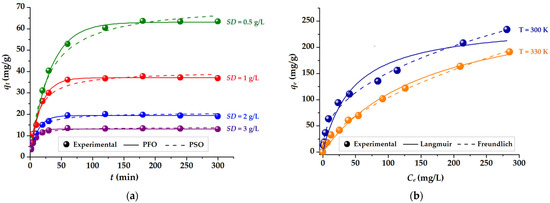 Adsorption of Methylene Blue onto CMC-Mn-S2 adsorbent: (a) experimental data for different sorbent doses (0.5–3 g/L) and mathematical kinetic models (pseudo-first order and pseudo-second order); (b) experimental data at two temperatures (300 and 330 K) and isotherm models (Langmuir and Freundlich).