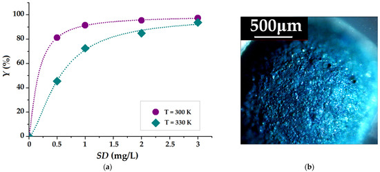 (a) Removal efficiency at equilibrium (%) of MB from aqueous solutions (C0 = 50 mg/L) as a function of sorbent dose (SD); (b) Image obtained by polarized light microscopy of the CMC-Mn-S2 surface after MB adsorption.