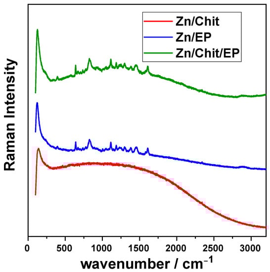 In the case of chitosan-coated zinc, no clear peaks were visible where the epoxy shows its characteristic peaks, due to the overlap of multiple peaks attributed to C-H and C-O-C bonds. Moreover, it was reported that, when the chitosan is diluted (as in the case of the aqueous Chit solution used in our case to achieve a thin layer), no separate peaks could be identified in the Raman spectra [].