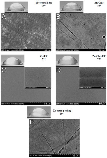 Contact angle measurements and SEM images of pretreated Zn (A), Zn/Chit (B), Zn/EP (C), Zn/Chit/EP (D), and Zn after the coating is peeled off (E).