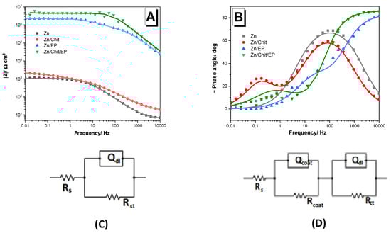 Bode impedance spectra of uncoated Zn and of Zn coated with Chit, EP, and Chit/EP, measured in 3 w/w% NaCl solution at OCP after 30 min immersion time; (A) absolute impedance and (B) phase angle plots; the impedance values were normalized to the total surface area of 2 cm2. (C,D) The fitted electrical equivalent circuits.