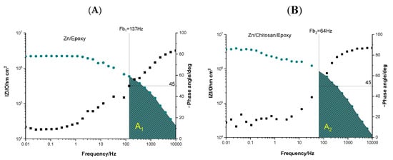 Graphical analysis also can be performed on the Bode diagrams. The area under the horizontal part of the plot at low frequencies, representing the resistive region, can be correlated with the penetration of electrolyte into the coatings’ pores and reflect its barrier properties. The capacitive behavior is related to the inclined part of the curve, and the area underneath corresponds to the capacitive region. The extent of the capacitive region indicates the coating’s performance []: a more extensive area shows a more intact and performant coating. In the case of the two abovementioned systems, it can be easily observed (Figure 6) that the capacitive region for the Zn/Chit/EP (A2 ≈ 3.77 × 109) is larger than that for the Zn/EP (A1 ≈ 2.23 × 109), confirming that the double coating provides better coverage of the zinc substrate.