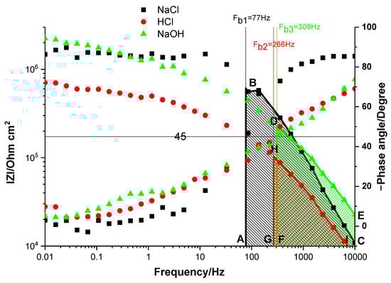 To test the resistance of the coatings in various corrosive electrolytes, the double-layered samples were soaked in 3 w/w% NaCl, 2 M NaOH, and 1 M HCl solutions, and, from the obtained EIS spectra, the breakpoint frequencies (Fb) were calculated. To get an interpretation of the coatings’ behavior in different conditions, the obtained Bode spectra were compared (Figure 7). Interestingly, the lowest value of the breakpoint frequency (Fb1 = 77 Hz) was obtained for the sample soaked in NaCl solution, and the capacitive region (area ABC) in this case had the largest value. This finding points out the protective nature of the coating. After immersion in the acid medium, the breakpoint frequency increased (Fb2 = 266 Hz), and the lowest area was obtained for the capacitive region (the GHI geometric shape), indicating advanced delamination of the coating. Taking into account that the chitosan is dissolved in acidic mediums and that, by immersion, the aggressive electrolyte can penetrate the coating, the delamination in this case can be easily explained by the adherence loss due to the primer coat’s dissolution. The alkaline medium causes an advanced deterioration of the coating in comparison with the NaCl solution but less than the acidic environment. Although the Fb value was lower, as was the capacitive region (marked by DECF), the decrease of ∣Z∣0.01Hz was small compared with that in the NaCl solution. This behavior is probably due to the deterioration of the upper epoxy layer.