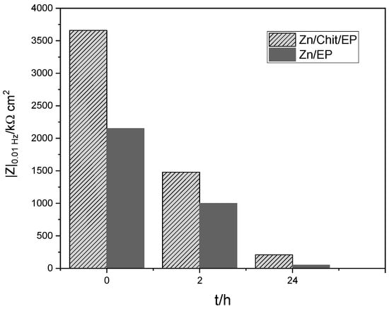 Absolute impedance values for Zn/EP and Zn/Chit/EP determined from Bode spectra as a function of immersion time.