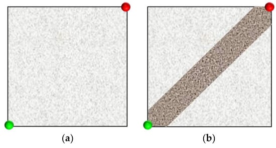 In our experiments, we designed a five-point well pattern unit, consisting of one injection well and one production well; this was based on the actual well pattern characteristics of polymer flooding in the Shengli Oilfield []. The five-point well pattern unit was then used to design strongly heterogeneous and weakly heterogeneous models (Figure 1). In this figure, the green circle represents the injection well, and the red circle represents the production well. The weakly heterogeneous model was filled with glass microspheres of an average size of 60 mesh, while the strongly heterogeneous model was filled with glass microspheres of an average size of 40 mesh in the high-permeability zone and 80 mesh in the low-permeability zone. The average porosities of these two models were 33.5% and 34.8%, respectively.