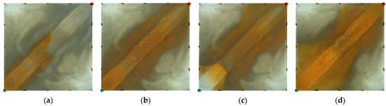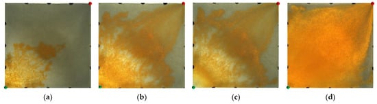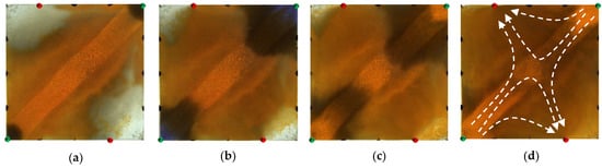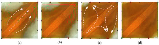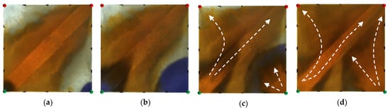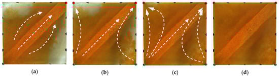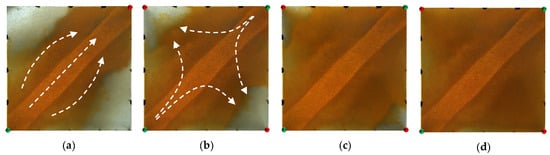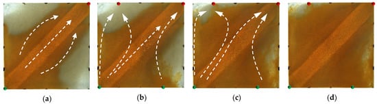 Scheme 2 in WAF experiments. (a) Initial stage of WAF. (b) Water cut stage of 50%. (c) Water cut stage of 80%. (d) Water cut stage of 95%. White arrows represent the flooding direction.