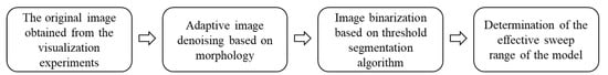 The sweep efficiency is a very important factor affecting reservoir recovery [] and can intuitively reflect the sweep degree of the displacement phase. At present, the determination methods for sweep efficiency include the core test method and the numerical simulation method. Of these, the core test method cannot intuitively display the swept position of the displacement phase, while the numerical simulation method cannot accurately describe the swept range for the actual model. In addition to these two methods, image processing technology for a visual model has also been applied for the determination of sweep efficiency []. Compared with traditional methods, the image processing method can divide the swept areas conveniently and intuitively. A flowchart showing the image processing technology is provided in Figure 6. By graying the obtained images [,,] and then thresholding the images according to the two-dimensional Otsu image threshold segmentation algorithm [], an appropriate grayscale image threshold was selected; then, the target and background were segmented via the grayscale threshold (Figure 7) so as to convert the grayscale image into a binary image that could reflect its local and overall characteristics.