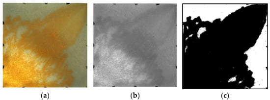 Experimental image processing technology. (a) Original image. (b) Grayscale image. (c) Threshold segmentation image.