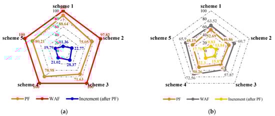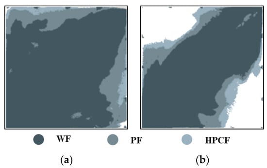 Stacked diagrams of swept range of different models (WF (water flooding), PF (polymer flooding) and HPCF (HPC flooding) from deep to shallow). (a) Weakly heterogeneous model. (b) Strongly heterogeneous model.