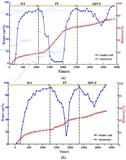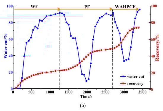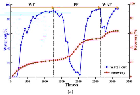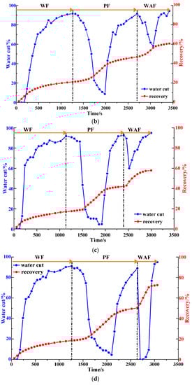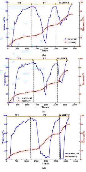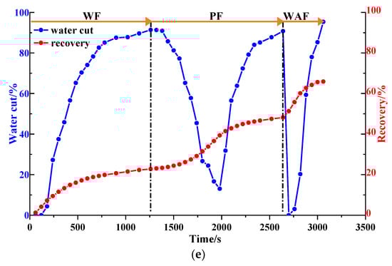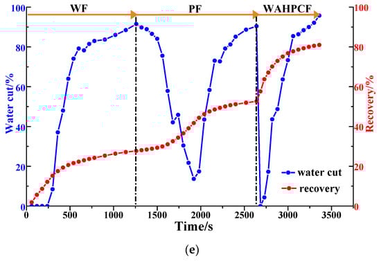 As shown in Figure 16b and Figure 17, after well pattern adjustment, the recovery factor for each scheme improved to a certain extent. In the non-conversion schemes, due to the ineffective water displacement along the high-permeability channel, although the water cut decreased after the well pattern adjustment, the decrease was so limited as to result in a small increase in the recovery, as shown in Figure 17a–c. Among the non-conversion schemes, Scheme 3 had the highest enhanced oil recovery (EOR) value at 15.87%, followed by Scheme 2 with an EOR value of 13.84%, and Scheme 1 with the lowest EOR value at 10.83%. However, for the conversion schemes, the mainstream area significantly increased after the transfer injection, and under the synergistic effect of residual polymers, the water cut decreased significantly compared with those non-conversion schemes, as shown in Figure 17d,e. There was a certain period of anhydrous or extremely low water cut production in both schemes, and their recoveries significantly improved. As new seepage channels were formed after the injected water broke through, the water cut increased rapidly, and the development characteristics of the high-water-consumption zones became obvious. After well pattern adjustment, the conversion schemes improved the oil recovery significantly better than the non-conversion schemes. The recovery factors of the two conversion schemes after polymer flooding increased by 22.3% and 17.71%, respectively. Furthermore, after polymer flooding, the effective production time in all five WAF experiments was shorter than that in the HPCF experiment (960 s, as shown in Figure 9b), ranging from 420 s to 720 s.