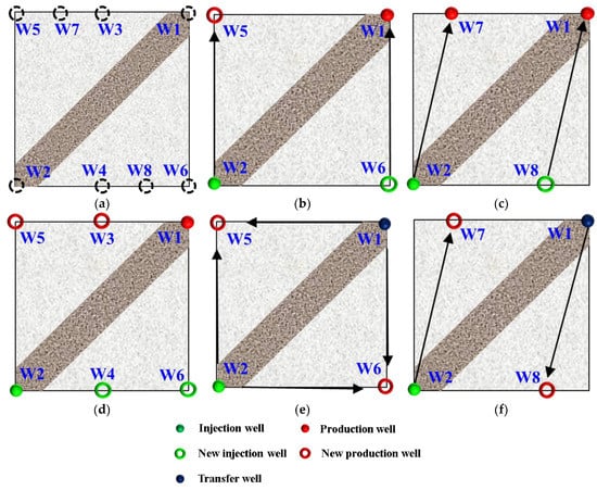 The efficient development of unswept remaining oil is the key to improving oil recovery []. After HPC flooding, due to the high-permeability channel between the injection and production wells, there was still a large amount of oil remaining in the non-mainstream areas, with a limited increase in the sweep efficiency, especially for the strongly heterogeneous model. Well pattern densification and adjustment (WA) is an effective measure by which to change the flow field direction, forcibly utilize the remaining oil and expand the sweep efficiency. In order to study the influence of different WA schemes on the oil displacement effect after polymer flooding, five post-polymer flooding schemes were designed for the strongly heterogeneous model (Figure 10). The five schemes were divided into non-conversion schemes, Schemes 1, 2 and 3, and conversion schemes, Schemes 4 and 5, with the original production wells, W1 in Schemes 4 and 5, being converted into injection wells.