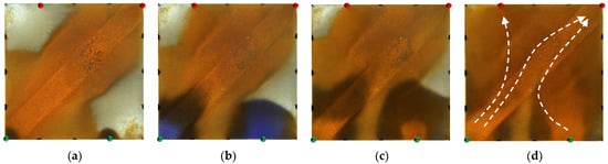 Scheme 3 in WAF experiments. (a) Initial stage of WAF. (b) Water cut stage of 50%. (c) Water cut stage of 80%. (d) Water cut stage of 95%. White arrows represent the flooding direction.