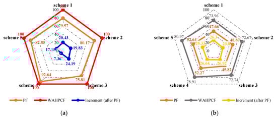 From the sweep efficiency changes at different flooding stages for the five schemes shown in Figure 23a, it can be seen that after polymer flooding, the well adjustment combined with HPC flooding not only significantly utilized the oil in the unswept areas, but also deeply excavated the remaining oil. Compared with the WAF experiments, under the same well pattern adjustment conditions, the sweep efficiencies of the five schemes achieved 100% after HPC flooding, which indicates that the well pattern adjustment had a positive effect on the HPC flooding.