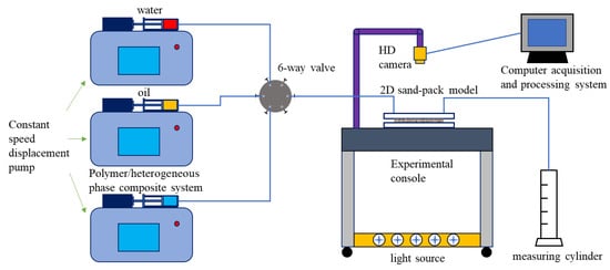 The two-dimensional sand pack visual displacement device that was used is shown in Figure 25. The device comprises a positive displacement pump that can maintain a constant flow and speed, an experimental console, a syringe, an LED light, a high-resolution camera, a measuring cylinder, a computer acquisition and processing system, and a plane sand pack model.