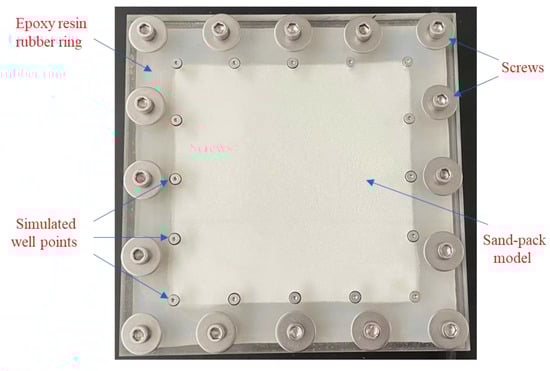 Figure 26 shows the plane sand pack model, which is composed of two glass plates, one upper and one lower, that are 2 cm thick each. There is a groove in the lower plate where the epoxy resin rubber ring is placed. The overall size of the model is 35 cm × 35 cm, wherein the sand pack area is 28 cm × 28 cm, and 3 mm thick. In addition, the model has 16 screws for compaction sealing; 16 simulated well points are set around the sand pack area.