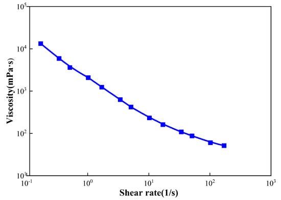 Polymer: In this study, the polymer provided by the Shengli Oilfield was partially hydrolyzed polyacrylamide (HPAM) with a molecular weight of 2.0 × 107 and with a relative molecular weight of 89.55% solid content. The concentration of the polymer solution prepared with ultrapure water was 1000 mg/L, and an automated high-pressure and high-temperature viscometer (AMETEK Chandler Engineering, model 5550) was used to test the rheology of the polymer solution at room temperature. As shown in Figure 27, the polymer solution had good rheology at room temperature, and its apparent viscosity decreases with the increase in the shear rate.