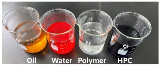 Dyeing agents: Two dyeing agents, namely methyl orange (molecular formula: C14H14N3NaO3S) and methyl blue (molecular formula: C37H27N3Na2O9S3), were used in the experiment to dye the experimental displacement water and HPCF system, as shown in Figure 29.