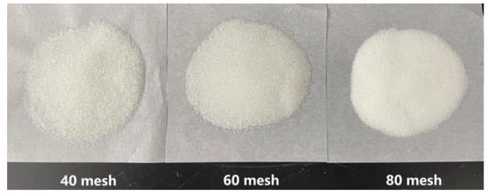 - Clean the glass microspheres with ultrapure water to remove impurities and dry them at a high temperature (120 °C) to ensure that the wettability of the glass microspheres is consistent []. The glass microspheres of different meshes used in the experiments are shown in Figure 30;