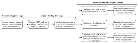 The experimental displacement process was designed as shown in Figure 31, including the water flooding stage, polymer flooding stage and regulation stage after polymer flooding; the process was conducted at a room temperature of 26 °C. With regard to the regulation stage after polymer flooding, HPC flooding, well pattern intensification and adjustment (WAF), and the combination of the two (WAHPCF) were considered. The polymer, PPG and surfactant concentration of the HPC system were 1000 mg/L, 500 mg/L and 2000 mg/L, respectively, and the well pattern intensification and adjustment were based on the model of the original well pattern unit. During the experiments, some graduated cylinders were used to record the total volumes of fluid and oil produced every 50 s, so as to calculate the water cut and the oil recovery of each flooding stage.