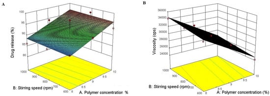 Showing 3D response surface plots for in vitro drug release (A) andviscosity (B) showing the influence of the concetration of polymer and stirring speed.