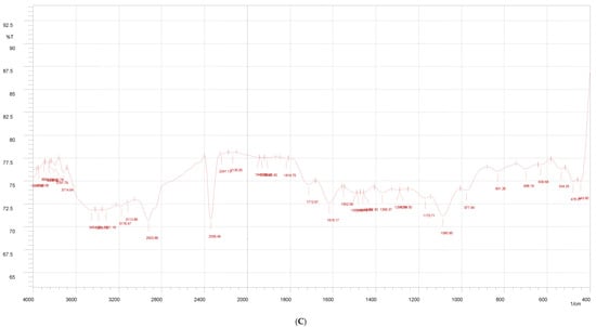 The FTIR spectrum of the propolis hydrogel formulation shows peaks of –OH stretching at 3571.52 cm−1 and 3541.63 cm−1; C–H stretching at 3083.62 cm−1, 1639.2 cm−1, 1594.8 cm−1, and 1164.7 cm−1 with decreased intensity; and prominent peaks at 3325 cm−1 due to the O–H stretching vibration, 2937 cm−1 due to the C–H stretching vibration, 1419 cm−1 due to C–O carbonyl stretching, and 1245 cm−1 due to the C–H bending vibration of CH 2, confirming the presence and distribution of propolis in the hydrogel formulation.