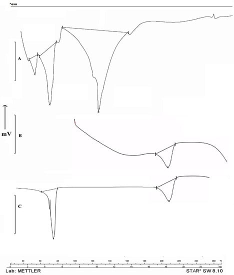 The differential scanning calorimetry (DSC) thermograms of propolis extract and formulation were conducted on a DSC 821e (Mettler-Toledo, Greifensee, Switzerland). Samples were (5 mg) heated in a hermetically sealed aluminum pan with a heating rate of 10 °C/min under a nitrogen atmosphere (flow rate 50 mL/min) [26].