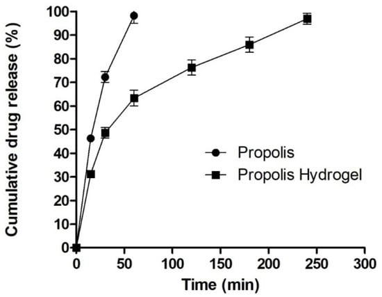 The drug release pattern from the hydrogel formulation is closely related to the drug interaction and matrix structure. The propolis release pattern obtained from the hydrogel formulation is presented in Figure 5. The release study reveals a biphasic drug release pattern where an initial burst release pattern of the drug was observed during first 40 min, with about 40% of the drug being released, followed by a comparatively slow release up to 4 h. The pattern might be due to the dense hydrogel matrix with strong physical drug–hydrogel interactions which reduces drug release through hydrogel as compared with pure drug release, which releases in 70 min with a 98.22% release. The detailed mechanism with effects of pore size and water absorption capacity can be further investigated.