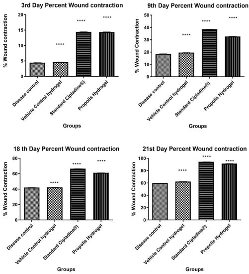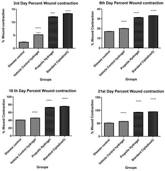 Wound contraction of all the animals of the excision model was measured on the3rd, 9th, 18th, and 21st days after the creation of the wound. It was found that propolis hydrogel exhibits significant wound healing activity when compared against the standard and control groups (*** p < 0.0001), as shown in Table 5 and Figure 8.