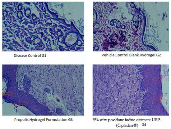 Photomicrograph in 40× lens showing histopathological changes of healed skin wounds on day 21 post wound (stained with hematoxyline and eosin). G1: diseased control; G2:vehicle control (blank hydrogel); G3: propolis hydrogel formulation; G4: treated with 5% w/w povidone iodine ointment USP (Cipladine®). Arrow shown indicates improved re-epithelialization.
