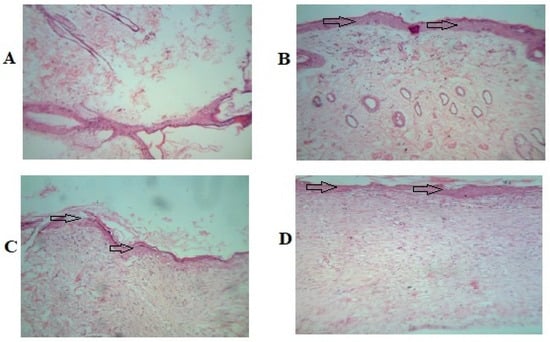 Photomicrographs in 40× lens of the histopathological section of wound tissue. (A) Group 1 (untreated group) animal wound tissue. (B) Group 2 (vehicle control) animal wound tissue. (C) Group 3 treated with 5% w/w povidone iodine ointment USP (Cipladine®). (D) Group 4 propolis hydrogel-treated animal wound tissue. Arrow shown indicates improved re-epithelialization.