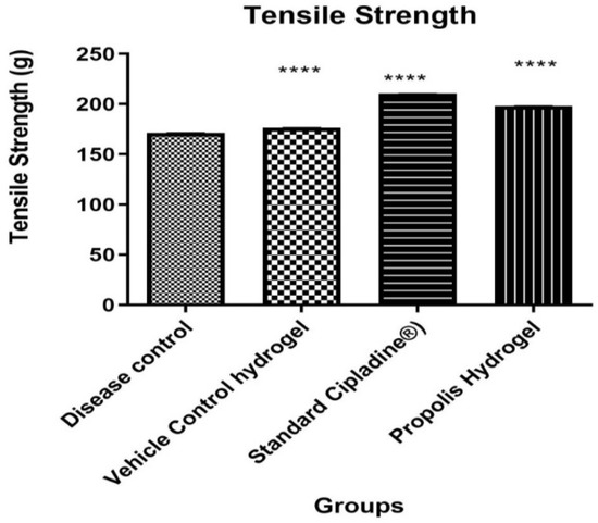 Effect of propolis hydrogel on tensile strength (Data were analyzed by one-way ANOVA followed by Tukey–Kramer Multiple Comparison Test **** p < 0.0001).
