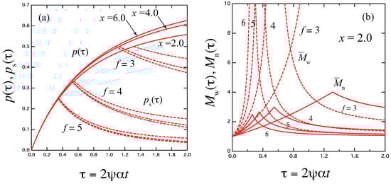 (a) Reactivity for the functionality plotted against the dimensionless scaled time for various scaled concentration (solid lines). The relaxation time is independent of f as a function of , so that depends only on x. Broken lines are the reactivity of the sol part in the post-gel region. (b) The weight-average molecular weight (broken lines) and the number-average molecular weight (solid lines) plotted against the scaled time for the concentration . The number-averages are finite at the gel point.