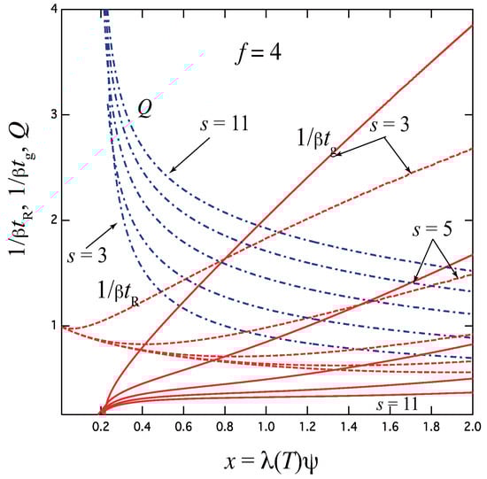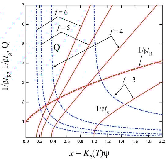 The reciprocal gelation time (solid lines), reciprocal relaxation time (broken lines), and thermodynamic factor Q (broken dotted lines) plotted against a combined variable for various functionality f. goes logarithmically to zero near the equilibrium sol–gel transition point , while it is proportional to x at high concentration regions. is independent of f, and remains finite at the gel point, while Q goes to infinity.