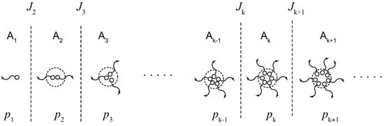 The model solution we consider is a polymer solution in which the number N of reactive (associative) molecules (denoted as R{A}) with degree of polymerization n are dissolved in the number of solvent molecules (S). Molecules can be any type, such as high molecular weight linear polymers, star polymers, low molecular weight polyfunctional molecules, etc. Each molecule carries the number f of functional groups A (functionalityf), which can form interchain cross-links made up of variable number k of A-groups (multiplicityk) [,,].