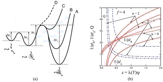 The relaxation time similar form to (55) was first proposed by Kresheck et al. [] (referred to as KHDS), and later by Muller [] for the self-assembled micelle formation in solutions of surfactant molecules studied by temperature-jump experiments. The KHDS form was derived under the assumption that, in the stepwise association of the surfactant molecules, the last step is slowest compared to the intermediate steps, and hence it is the rate-controlled step.