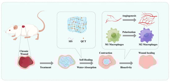 As a biomaterial that can promote wound healing, SIS has been widely used as a bio-scaffold material in clinical use []. SIS, as an extracellular matrix, can support angiogenesis, cell migration, and proliferation, offering growth factors involved in tissue formation signaling and assisting wound healing []. In a clinical study using the SIS wound matrix for the treatment of chronic venous ulcers, a significant reduction in MMP-1, MMP-2, MMP-3, MMP-9, TNF-α, and IL-8 in wounds was observed []. Zhang et al. [] loaded SIS membranes with silver nanoparticles, and the modified scaffolds effectively treated burn wounds infected with Pseudomonas aeruginosa with a reduction in IL -6 and C-reactive protein. Singh et al. [] incorporated curcumin into SIS membranes. The modified membranes have good antimicrobial ability and can scavenge free radicals, effectively neutralizing oxidative stress and biofilm formation problems in skin wounds. SIS has, therefore, been widely recognized as an extracellular matrix biomaterial for its ability to repair wounds. In addition, the properties and functions of hydrogel—biocompatibility, biodegradability, low immunogenicity, extended treatment time, and ease of handling—make it more suitable for wound repair [].