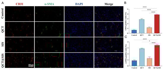Neovascularization is a vital part of diabetic wound repair. Hyperglycemia in diabetes may cause vasoconstriction and inhibit angiogenesis, thereby hindering the wound healing process by blocking the oxygen supply. Angiogenesis plays a crucial role in the wound healing process, and it can deliver oxygen and nutrients to the wound area []. Based on in vitro analyses, QCT@SIS hydrogel had an effective angiogenesis-promoting effect on HUVECs. However, the in vitro angiogenic capacity of QCT@SIS hydrogel-affected angiogenesis in diabetic wounds is unknown. We evaluated the in vivo angiogenic effects of QCT@SIS hydrogel by immunofluorescent labeling of the angiogenesis marker cluster of differentiation-31 (CD31) and the vascular smooth muscle marker alpha-smooth muscle actin (α-SMA) [,,]. Figure 6A shows the fluorescence of CD31 and α-SMA. The QCT@SIS hydrogel group exhibited better neovascularization. The average positive ratios of CD31 and α-SMA in the QCT@SIS group were 3.870% and 3.440%, respectively. The fluorescence analysis of CD31 and α-SMA demonstrated that the positive ratio significantly increased in the QCT@SIS hydrogel group compared with those in the remaining groups, with the pure QCT-treated group ranked second place (Figure 6B,C). Additionally, in the QCT@SIS hydrogel group, blood vessels exhibited larger size and luminal architecture, supporting the in vitro results of increased angiogenesis in HUVECs after the QCT@SIS hydrogel treatment. As reported in the previous study, diabetic wounds were treated by constructing a double cross-linked hydrogel. That the treatment of chronic wounds can be achieved by promoting neovascularization was shown by studying the expression of CD31 in skin tissue []. In another study, the authors treated diabetic wounds with a hydrogel prepared from oxidized dextran, platelet-rich plasma, and hyaluronic acid. High expression of α- SMA and CD31 was detected in the treated skin tissue []. In this study, we observed similar trends as in the previous study. This indicated the successful promotion of angiogenesis within the diabetic wounds by the QCT@SIS hydrogel.