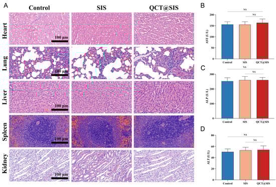 The biocompatibility of QCT@SIS hydrogel. (A) H&E staining of organs 14 days after injection into the shaved rat back; (B–D) Quantification of liver functional enzymes (ALT, ALP, and AST) in serum (n = 3). Significant levels were determined at NS > 0.05.