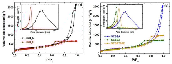N2-isotherms and pore size distribution (see insets) of (a) pure silica aerogel (SiO2A) and xerogel (SiO2X), and (b) of the three biomaterials under study (SCS8A, SCS8X and SCS8T10X).