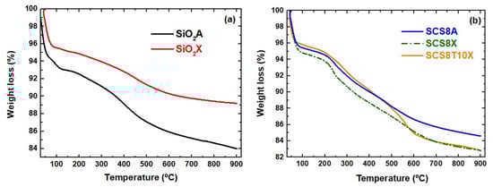 Thermograms of (a) (SiO2A) and (SiO2X) pure silica samples, and (b) of SCS8A, SCS8X, and SCS8T10X biomaterials.