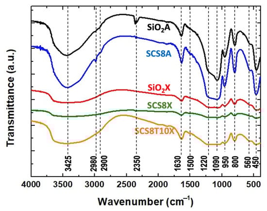 A few significant differences were observed in the FTIR spectra of the aerogels and the xerogels (Figure 4). First, aerogels (SiO2S and SCS8A) often display larger and more intense bands at 450 cm−1 and 800 cm−1 (Si-O-Si bending vibration), and in the 1050–1200 cm−1 range (Si-O-Si stretching vibration), which are characteristics of the silica network []. This is because the supercritical drying technique used to create aerogels results in a more densely cross-linked network structure with a greater degree of polymerization, and therefore a more compact pore network structure. A shorter and narrower band, which denotes a lower level of polymerization and a more porous network structure, is generally observed in the same frequency region for the xerogels (SiO2X, SCS8X, and SCS8T10X). The stretching vibrations of the OH groups, which correspond to the 3200–3700 cm−1 range, where aerogels also show more prominent peaks, suggest a larger number of residual silanol groups (-Si-OH) and adsorbed water owing to their typical hydrophilic character. In addition, the peaks at 950 cm−1 and at around 2350 cm−1 in the SiO2A sample were attributed to the stretching and bending vibrations of the Si-OH bond, respectively, thus confirming the high -OH density at the aerogel surfaces []. Peaks at approximately 2900–3000 cm−1 were present only in the aerogels (SiO2A and SCS8A) accounting for C-H stretching vibrations due to the use of ethanol as s M!”olvent to preserve the samples before supercritical drying [].