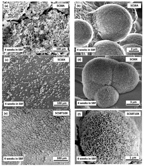 SEM micrographs of the surfaces of (a,b) SCS8A, (c,d) SCS8X, and (e,f) SCS8T10X hybrid gels after immersion in SBF for 28 days at 37 °C displaying strong bioactive response through the formation of a hydroxyapatite (HAp) layer.