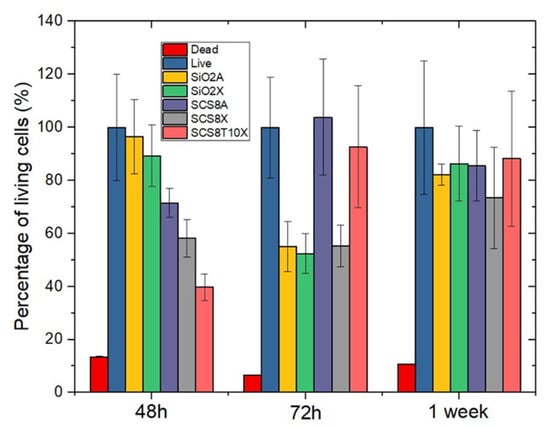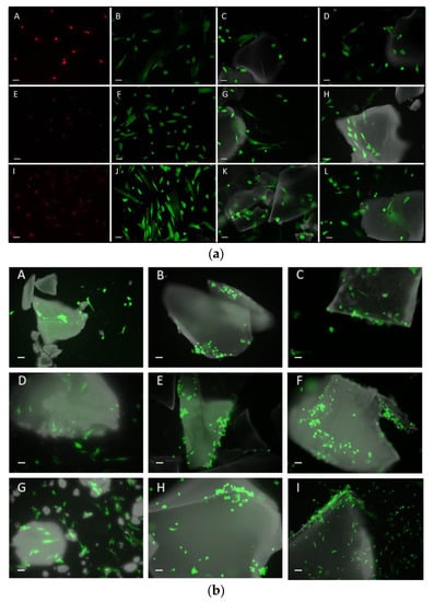 (a) Live/dead staining of HOB culture. Negative controls treated with 70% methanol for 30 min prior to staining: (A) 48 h HOB cultures, (E) 72 h HOB cultures and (I) one-week HOB cultures. The cultures of live control osteoblasts (positive control) were untreated cells grown underoptimal conditions at the described timepoints. Positive controls: (B) 48 h HOB cultures, (F) 72 h HOB cultures and (J) one-week HOB cultures. HOB cultures with SiO2A: (C) 48 h HOB cultures, (G) 72 h HOB cultures and (K) one-week HOB cultures. HOB cultures with SiO2X: (D) 48 h HOB cultures, (H) 72 h HOB cultures and (L) one-week HOB cultures. Green: living cells; red: dead cells and materials in gray. Scale: 20 μm. (b) Live/dead staining of HOB cells grown in the presence of SCS8A: (A) 48 h HOB cultures, (D) 72 h HOB cultures and (G) one-week HOB cultures. HOB cultures with SCS8X: (B) 48 h HOB cultures, (E) 72 h HOB cultures and (H) one-week HOB cultures. HOB cultures with SCS8T10X: (C) 48 h HOB cultures, (F) 72 h HOB cultures and (I) one-week HOB cultures. Live cells flouresce green; dead cells are imaged in red and materials in gray. Scale bar: 20 μm.
