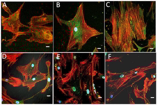 Immunolabelling and confocal examination of actin cytoskeleton with rhodamine phalloidin (red) and vinculin (green) for FAs of HOB® osteoblasts growing in culture in the presence of: SCS8A (A), 48 h culture; (B) 72 h culture; (C) 1 week culture and osteoblasts growing in glass (controls) (D), 48 h culture; (E) 72 h culture; (F) 1 week culture. Blue, DAPI-labelled nuclei. Scale bar: 20 μm.