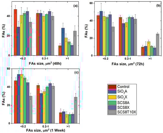 In SiO2A groups, as well as in SiO2X groups, small FAs predominated and the percentage increased after 72 h and 1 week, while medium- and large-sized FAs percentages decreased with time (Figure 11). This tendency persisted for 72 h and 1 week in culture. Nevertheless, in the SCS8T10 X groups, the percentage of mature FAs, sized > 1 square micron, remain stable for 48 h onwards and significantly increased with respect to the rest of the experimental groups after one week of culture. In control cells, small- and medium-sized FAs predominate at any experimental times.