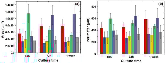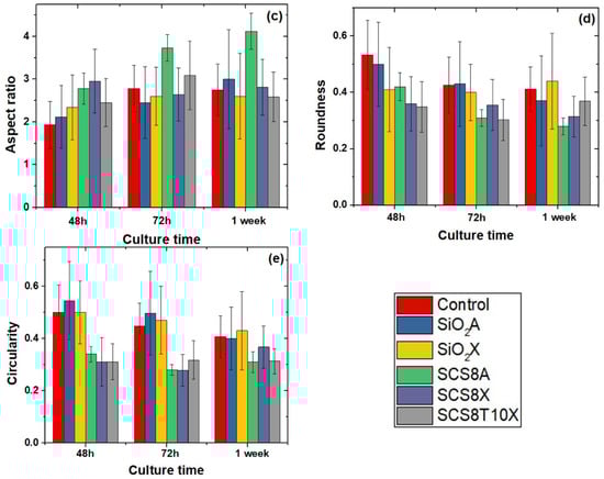 Morphological analysis of shape parameters revealed changes in cell area, mainly in SCS8A groups, which were the largest at initial times and elongated with time, as confirmed by the perimeter and aspect ratio data shown in Figure 12a–c. In contrast, cells grown on SCS8X increased both in area and perimeter, and consequently in aspect ratio, from 48 h to 72 h and finally 1 week. These data were consistent with FA expression, with small- and medium-sized FAs during all experimental times. Osteoblasts grown in the control groups and in biomaterials composed only of SiO2 presented a less complex cell morphology with the highest circularity values.