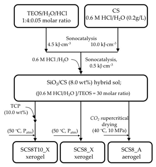 Process flow schematic for the production of SiO2/CS aerogels and SiO2/CS/TCP xerogels.