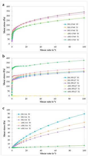 Rheograms of sterilized (sHG) and non-sterilized (HG) hydrogels based on Carbopol® 940 (C940) (a), Pluronic® F–127 (PF127) (b), and sodium alginate (SA) (c) obtained at one week (T0), two weeks (T1) and one month (T2) after preparation.